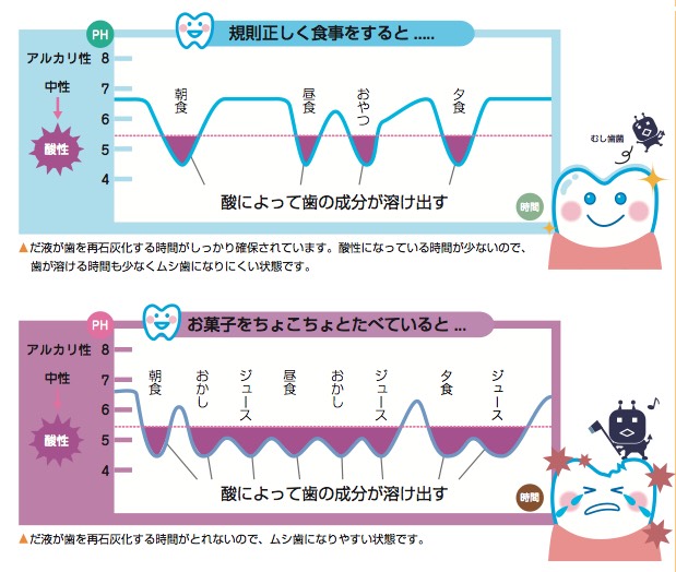 もともと口の中はPH6.8でほぼ中性の状態を保っていますが食事を始めるとすぐに酸性に傾きます。PHが5.5以下になると歯が少しずつ溶けはじめます。食事中はPHが元に戻ることはなく歯がゆっくりと溶ける状態が続き、食事を終えると唾液が口の中を中和し30分〜1時間ほどかけてPHを元に戻します。
